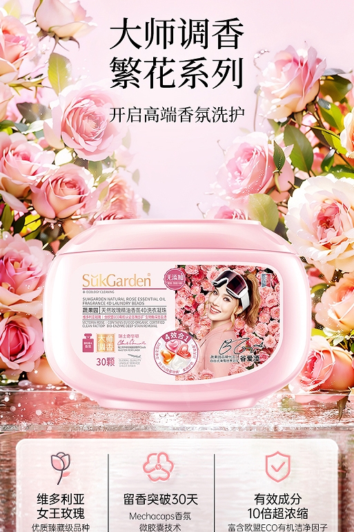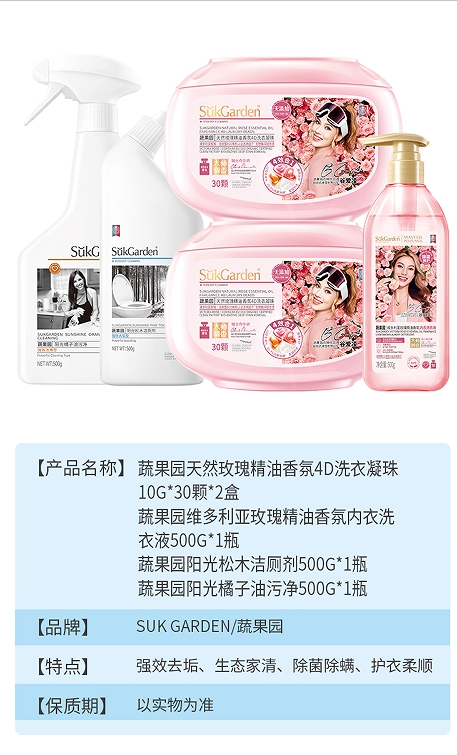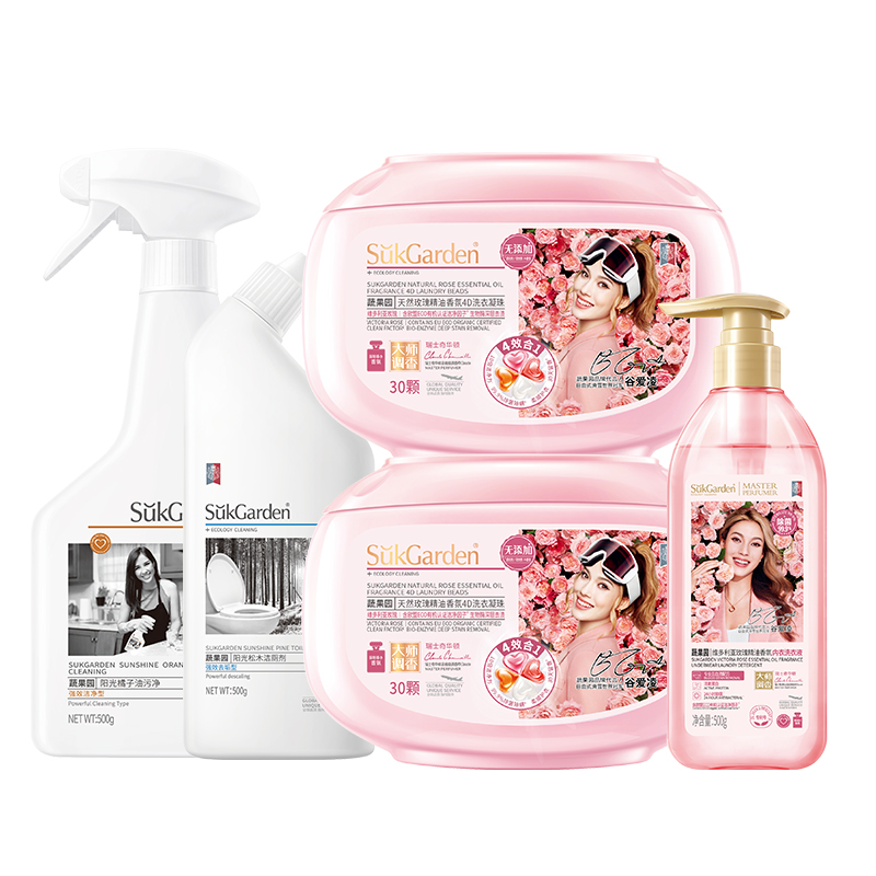 蔬果園天然玫瑰精油香氛4D洗衣凝珠10g*30顆*2盒+維多利亞玫瑰精油香氛內衣洗衣液500g*1瓶+陽光松木潔廁劑500g*1瓶+陽光橘子油污凈500g*1瓶